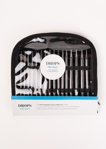 Praktická sada 8 párov mosadzných výmenných ihlíc DROPS PRO Spark s 3 lankami rôznych dĺžok, uložená v prehľadnom priehľadnom puzdre – všetko, čo potrebujete na pohodlné pletenie rôznych projektov.